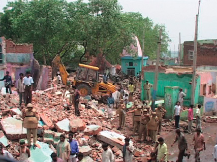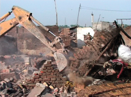 Bulldozers, going about their merciless job as people watch their homes being razed to the ground.